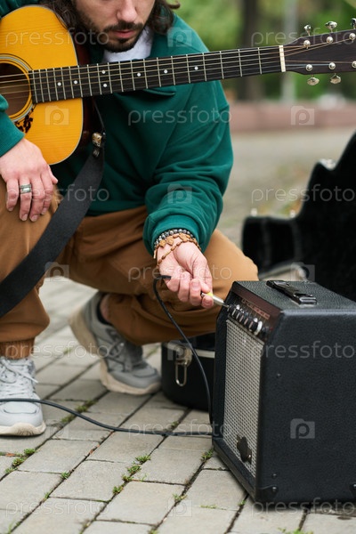 Молодой взрослый мужчина подключает акустическую гитару к усилителю на открытом воздухе