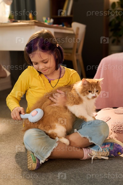 Девушка чистит пушистую кошку, сидя в помещении со скрещенными ногами