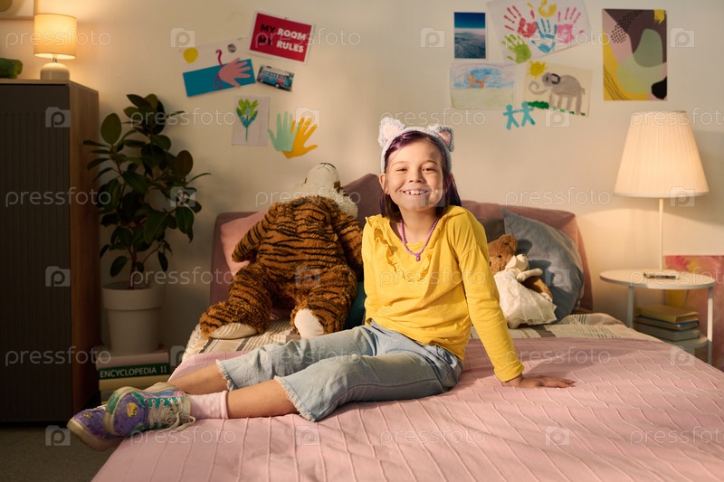 Портрет детской девочки, улыбающейся во время сидения на кровати в спальне