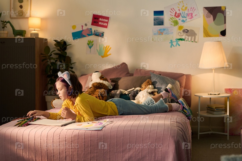Девушка лежит на кровати рисует цветными карандашами в уютной спальне