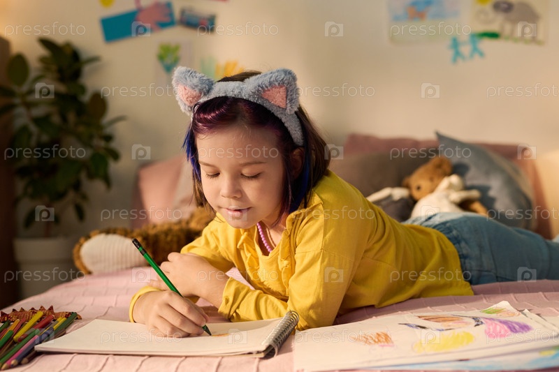Девочка-ребенок рисует, лежа на кровати в уютной домашней обстановке