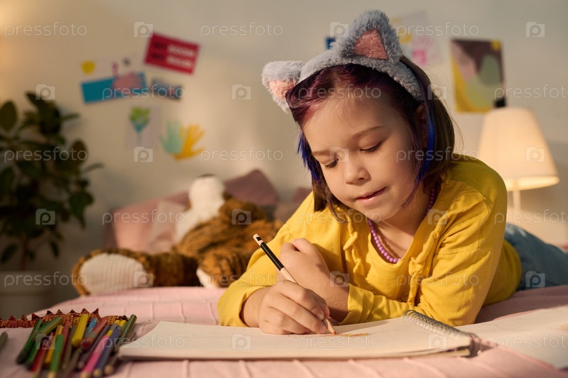 Девочка рисует цветными карандашами, лежа на кровати