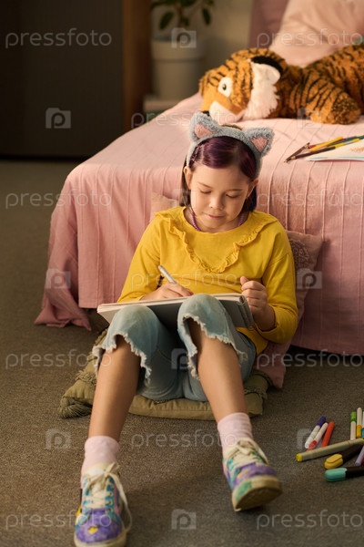 Девушка, сидящая на полу Рисование в блокноте возле кровати в спальне