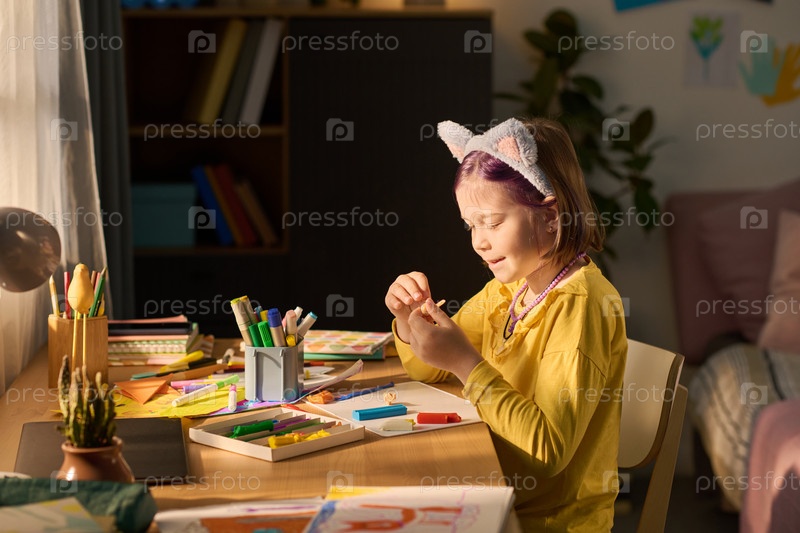 Девочка-ребенок, создающая произведения искусства с цветными маркерами на рабочем столе в помещении