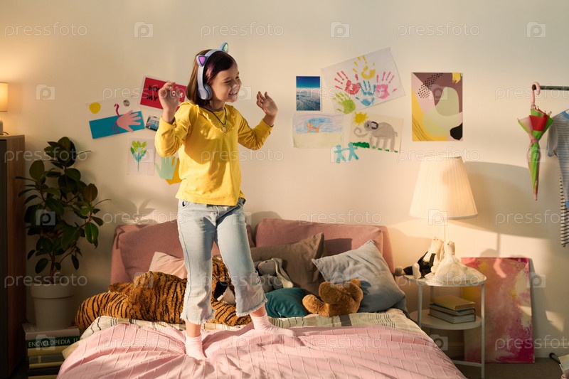 Девушка танцует на кровати, слушая музыку с наушниками