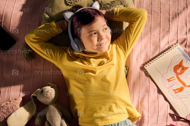 Улыбающаяся девушка слушает музыку с наушниками, рисуя