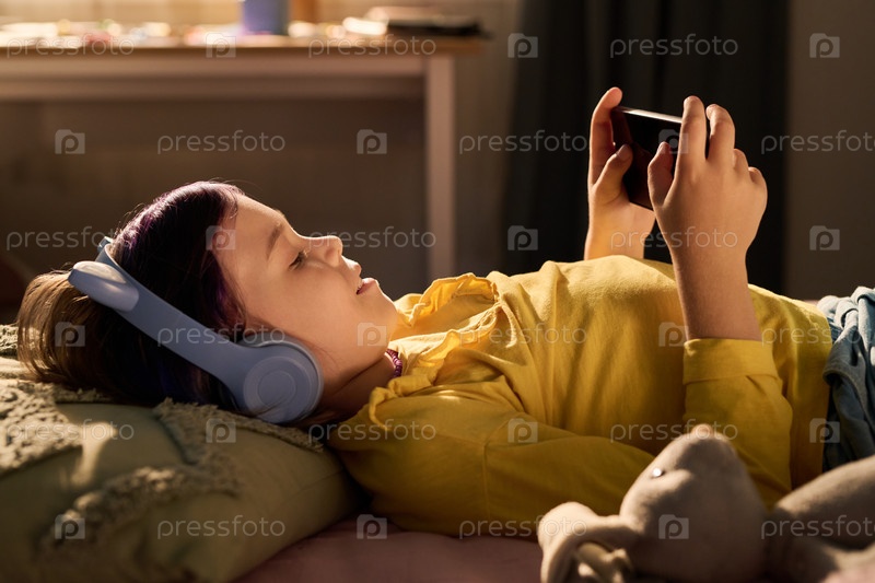 Девушка-подросток отдыхает в постели, слушает музыку и пользуется смартфоном