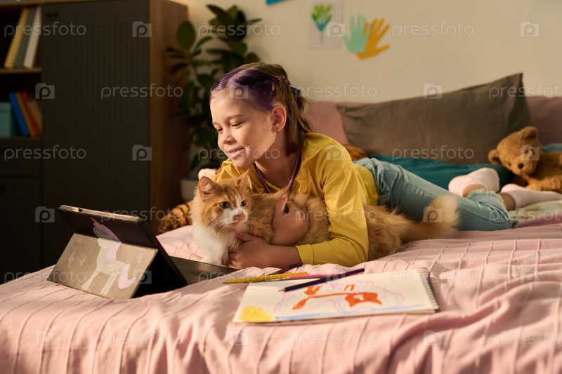 Девушка, лежащая на кровати и смотрящая планшет в то время как обнимает кота внутри