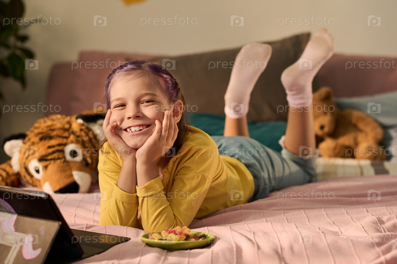 Портрет девочки-ребенка, улыбающейся во время просмотра планшета и расслабления