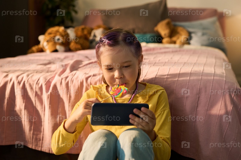 Ребенок смотрит видео на смартфоне, когда ест печенье