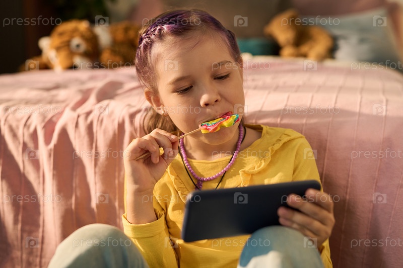 Девушка, съедающая леденец во время просмотра планшета сидит в помещении