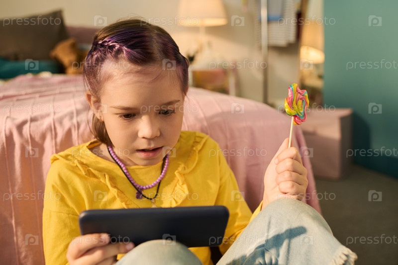 Ребенок смотрит видео на смартфоне, держа в руках девушку-лолипоп