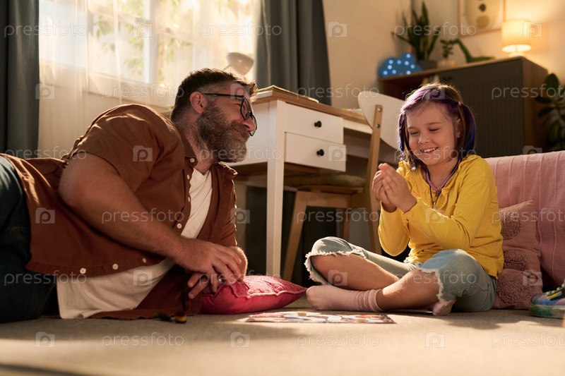 Мужчина средних лет смотрит, как улыбающийся ребенок рисует на полу в помещении