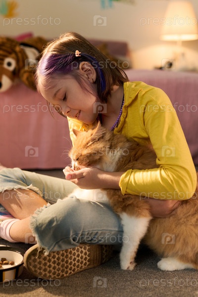 Девушка кормит кошку, сидя на полу в уютной обстановке спальни