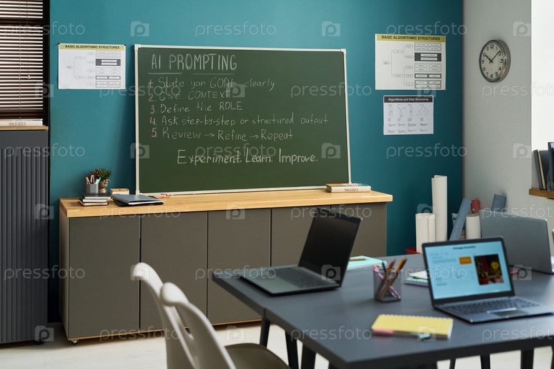 Пустой класс с ноутбуками и доской, на которой отображается искусственный интеллект, требующий инструкций