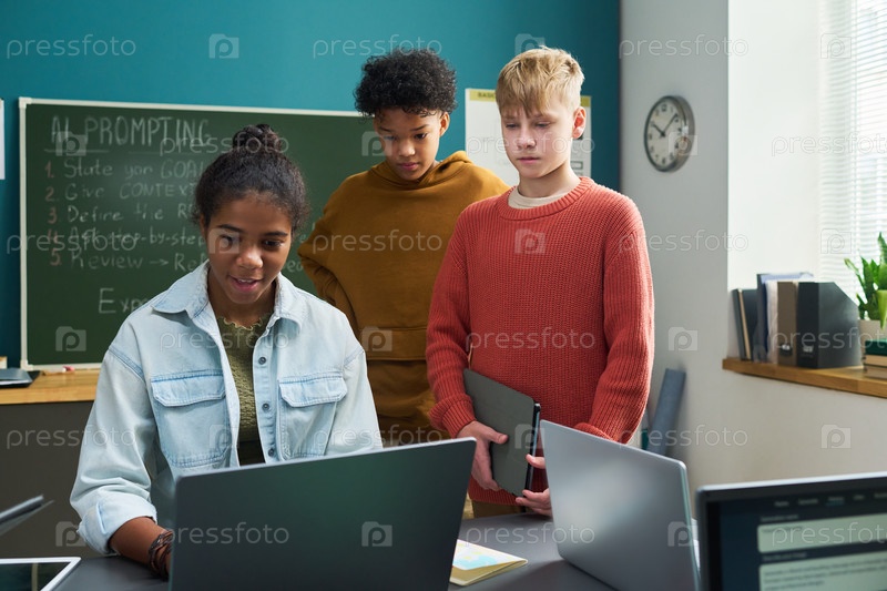 Мультиэтнические подростки сотрудничают на ноутбуке во время урока технологий в классе