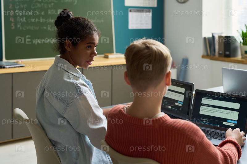 Многонациональные студенты-подростки сотрудничают на ноутбуках во время урока в классе