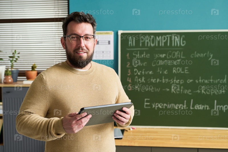 Портрет мужчины, держащего цифровой планшет в классе