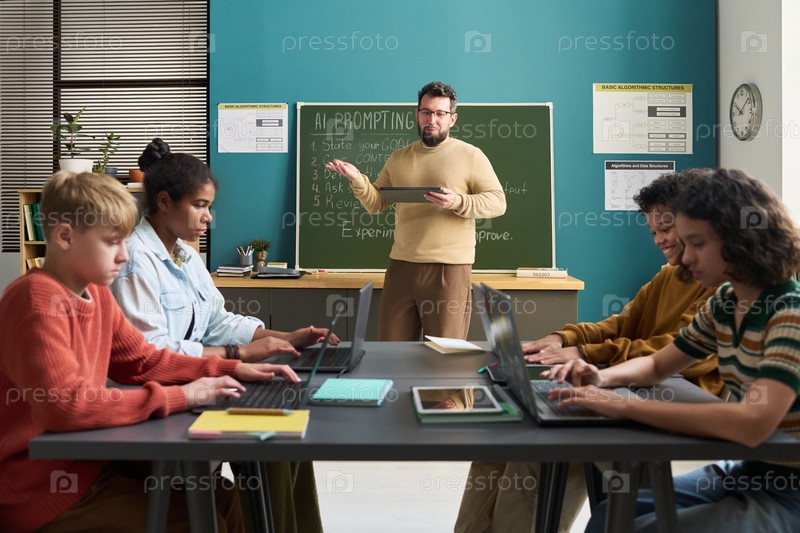 Различные подростки используют ноутбуки, в то время как учитель объясняет урок в классе