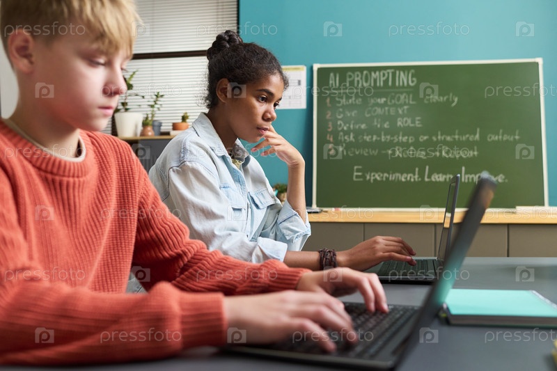 Мальчик-подросток и чернокожая девочка-подросток используют ноутбуки в классе