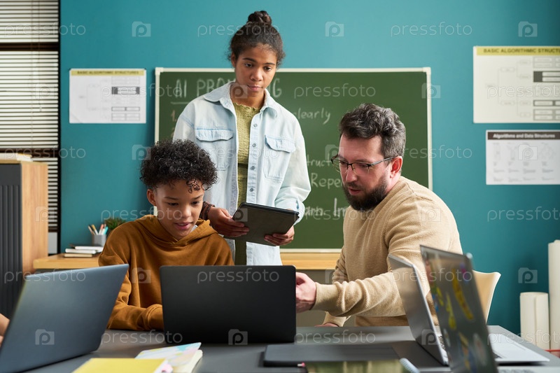 Человек учит двух чернокожих подростков использовать ноутбуки в классе