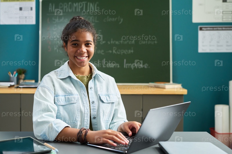 Портрет молодой чернокожей женщины, улыбающейся при использовании ноутбука в классной обстановке