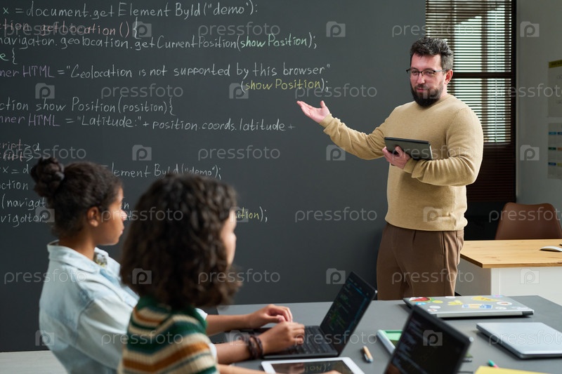 Мужчина, обучающий разных подростков компьютерному программированию