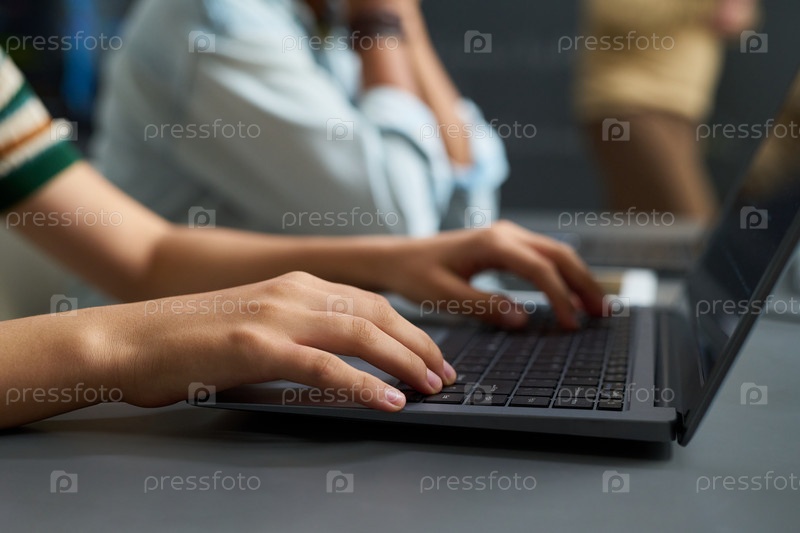 Девушка-подросток печатает на ноутбуке во время занятий в классе