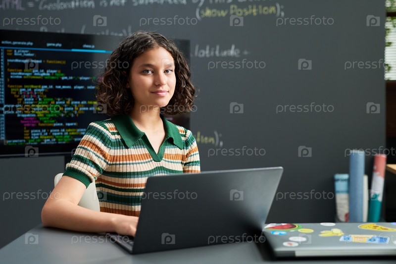 Портрет девочки-подростка, использующей ноутбук во время программирования в классе