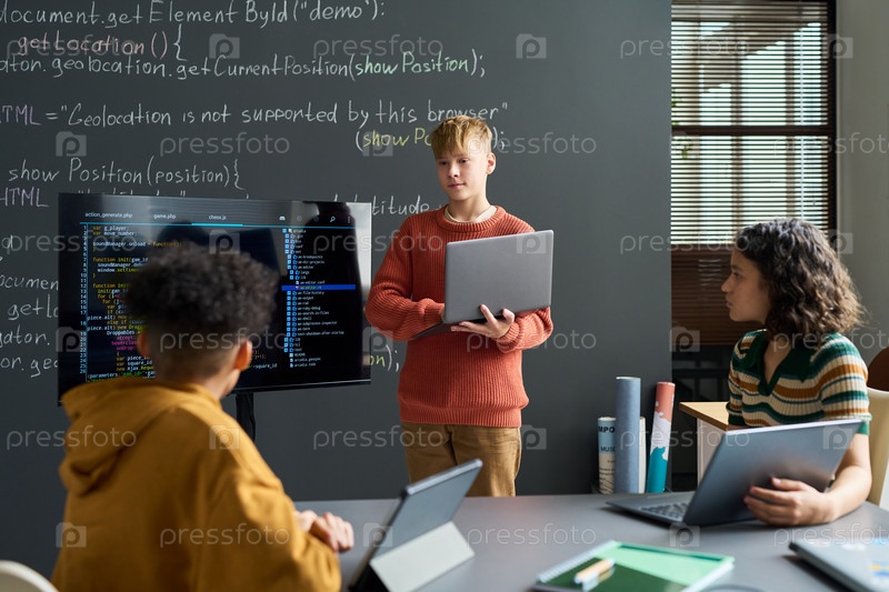 Мальчик-подросток представляет проект программирования различным одноклассникам