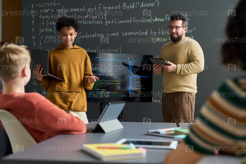 Мальчик-подросток представляет проект программирования с мужским учителем, наблюдающим