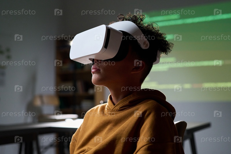 Подросток-мультиэтнический мальчик испытывает симуляцию виртуальной реальности в помещении