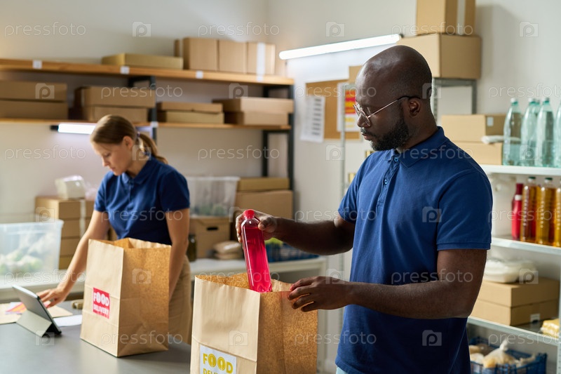 Молодой чернокожий человек упаковывает заказ на доставку еды с коллегой, работающей поблизости