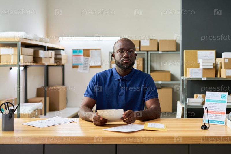 Портрет чернокожего человека среднего возраста, работающего за столом в офисе на складе