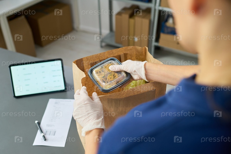 Молодая взрослая женщина упаковывает заказ на еду для доставки в складской обстановке