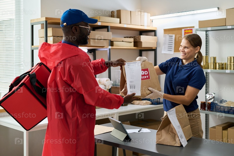 Молодая женщина доставляет продуктовый заказ черному мужчине среднего возраста