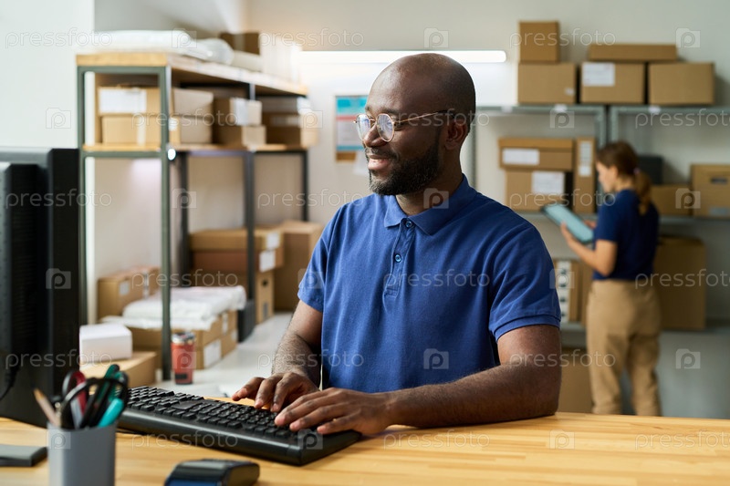 Молодой взрослый чернокожий мужчина работает на компьютере в офисной среде склада