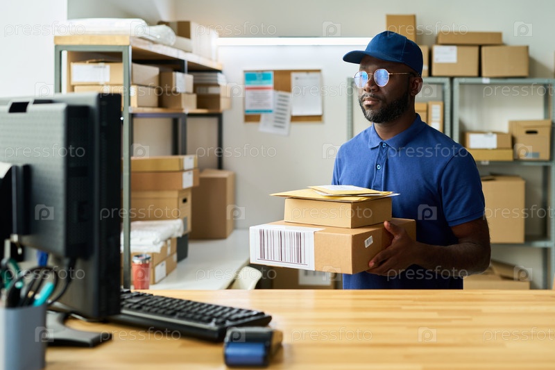 Молодой взрослый чернокожий мужчина, носящий шапку, держит пакеты во время работы на складе