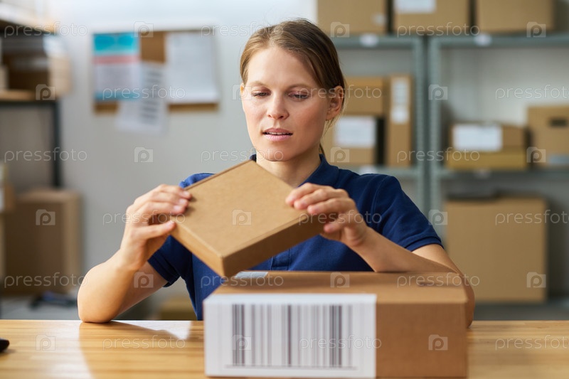 Молодая взрослая женщина упаковывает коробку для посылок во время работы на складе