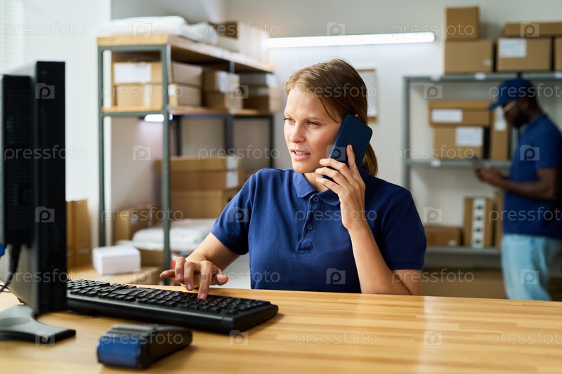 Молодая женщина работает на компьютере, разговаривая со смартфоном в складе