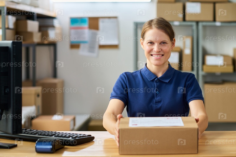 Портрет молодой взрослой женщины, улыбающейся при доставке посылки