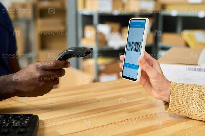 Черный мужчина сканирует штрих-код на смартфоне женщины