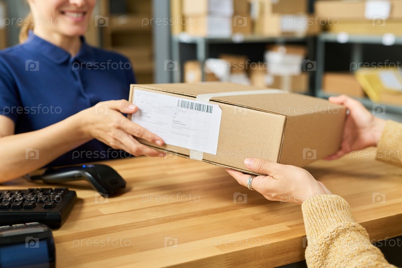 Молодая женщина передает почтовый ящик клиенту на прилавке