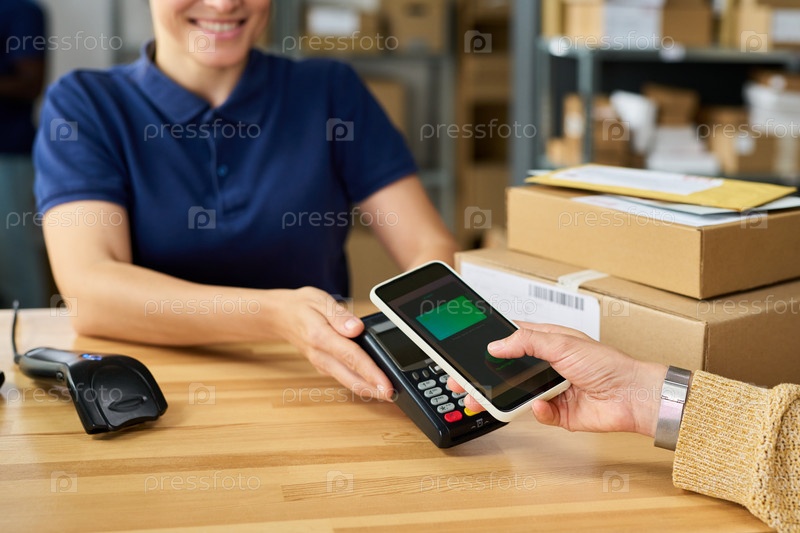 Молодая взрослая женщина обрабатывает бесконтактные платежи со смартфоном