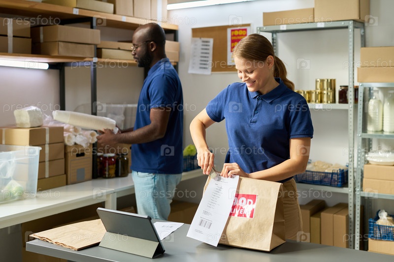 Молодая женщина упаковывает заказ, в то время как чернокожий организует инвентарь