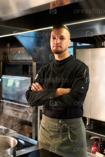 Портрет молодого взрослого мужчины, уверенно стоящего на кухне ресторана