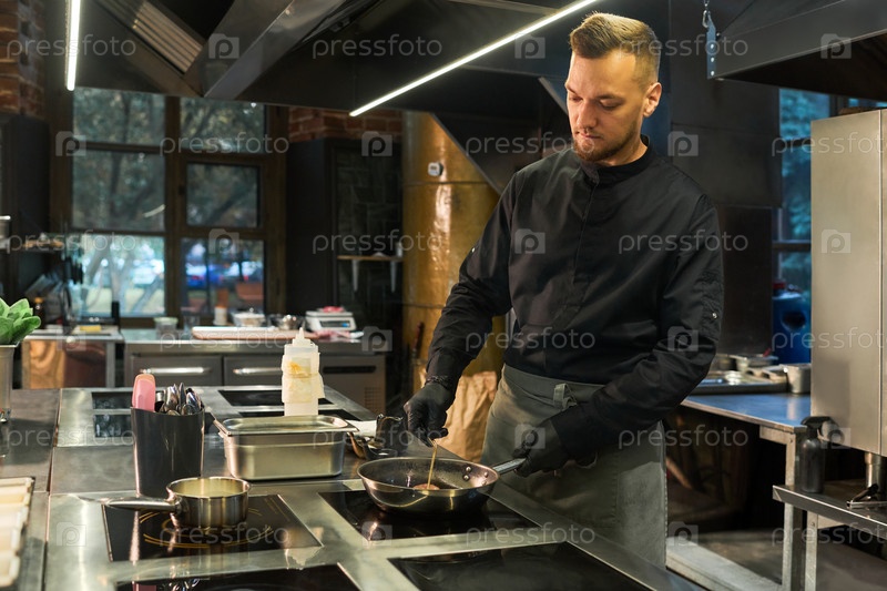 Молодой взрослый мужчина готовит еду на профессиональной кухне ресторана