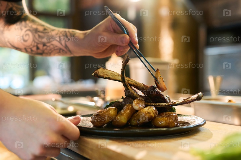 Молодой взрослый мужчина накрывает гастрономическую ягненковую сковороду с жареным картофелем