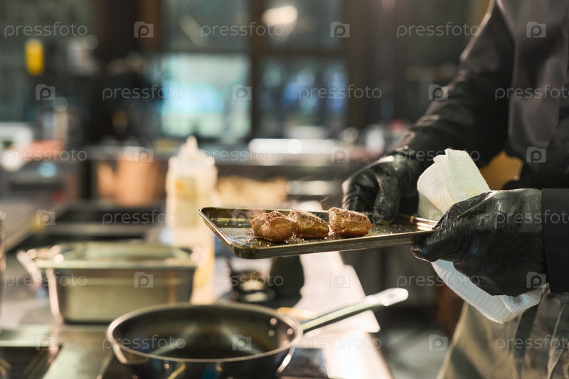 Мужской шеф-повар держит поднос с мясом во время приготовления пищи на кухне ресторана