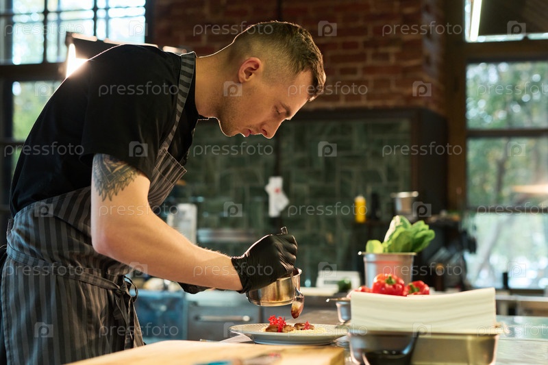 Молодой человек покрывает гурманское блюдо, работая на профессиональной кухне